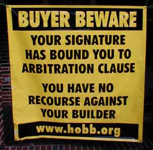 Texas and federal courts provide little protection to consumers trapped in arbitration agreements. The recent housing surge in the Lone Star State gave rise to a number of disputes between homeowners and homebuilders. Many homeowners learned, to their chagrin, that during the excitement of signing the contracts for their dream homes, they may have inadvertently signed away the constitutional right to have juries settle complaints against the homebuilders...In April 2002, Texas Lawyer reported an ongoing case of Dawn Richardson, an Austin homeowner, who filed a suit against David Weekley Homes after she learned that her family's new home allegedly was contaminated with dangerous levels of toxic mold and volatile organic compounds such as benzene, benzaldehyde, decane, heptane,formaldehyde, methylbenzene, octane, styrene and xylene. |